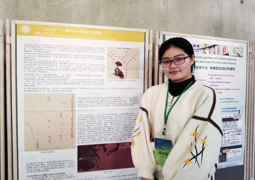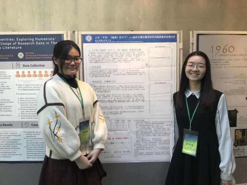 今年,张力元同学合作完成的长文章《伦敦大学国王学院30年数字人文研究热点分析》被会议录用并进行了展示。同样被录用的还有我系师生参与合作完成的两篇海报:杨明仪同学、王军老师和邱勇同学合作完成的海报《“一花开五叶”——禅宗传承视觉化平台构建》;杨浩老师(北京大学哲学系)、杨明仪同学、刘千慧同学、王军老师合作完成的海报《以何“半部”<论语>治天下?——基于文档向量相似性的论语篇章结构分析》。