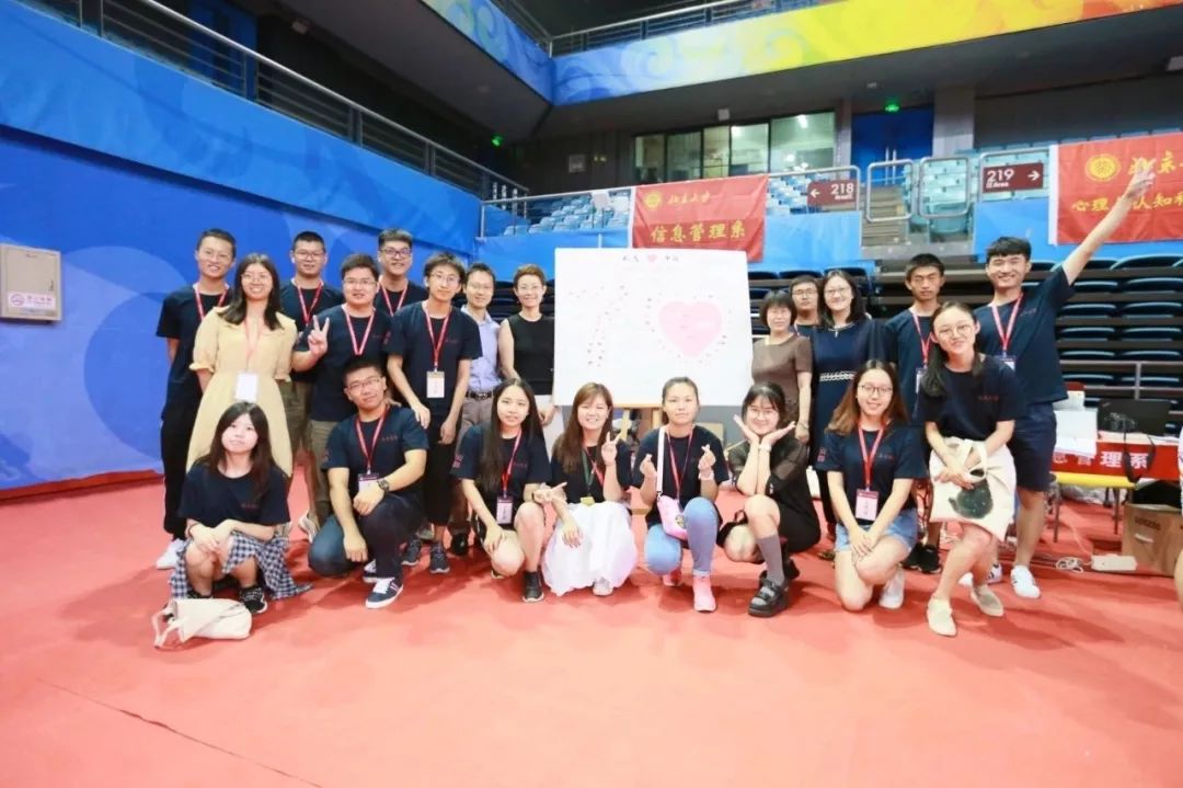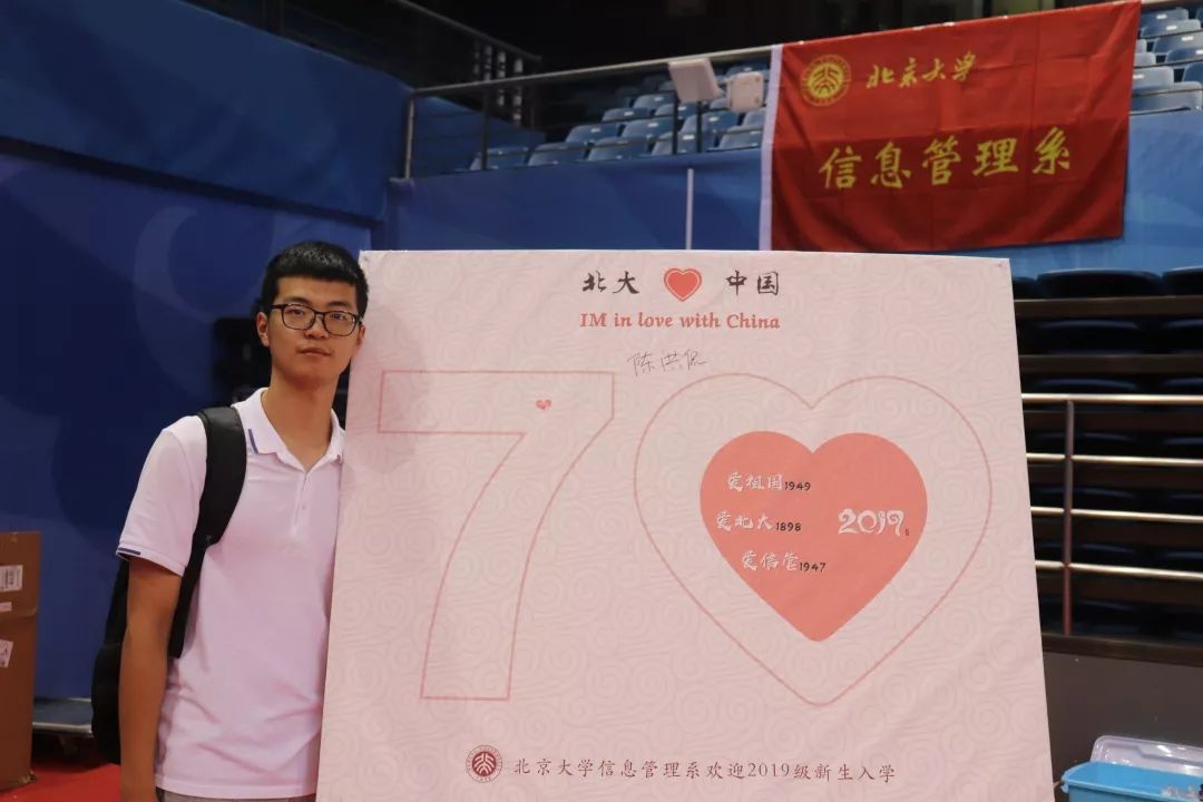 热情的迎新师生井然有序地帮他完成了身份验证、档案收取、礼包发放、签名绘心等一系列流程,并在信管系祝福祖国70周年生日的主题迎新展板前拍照留念。