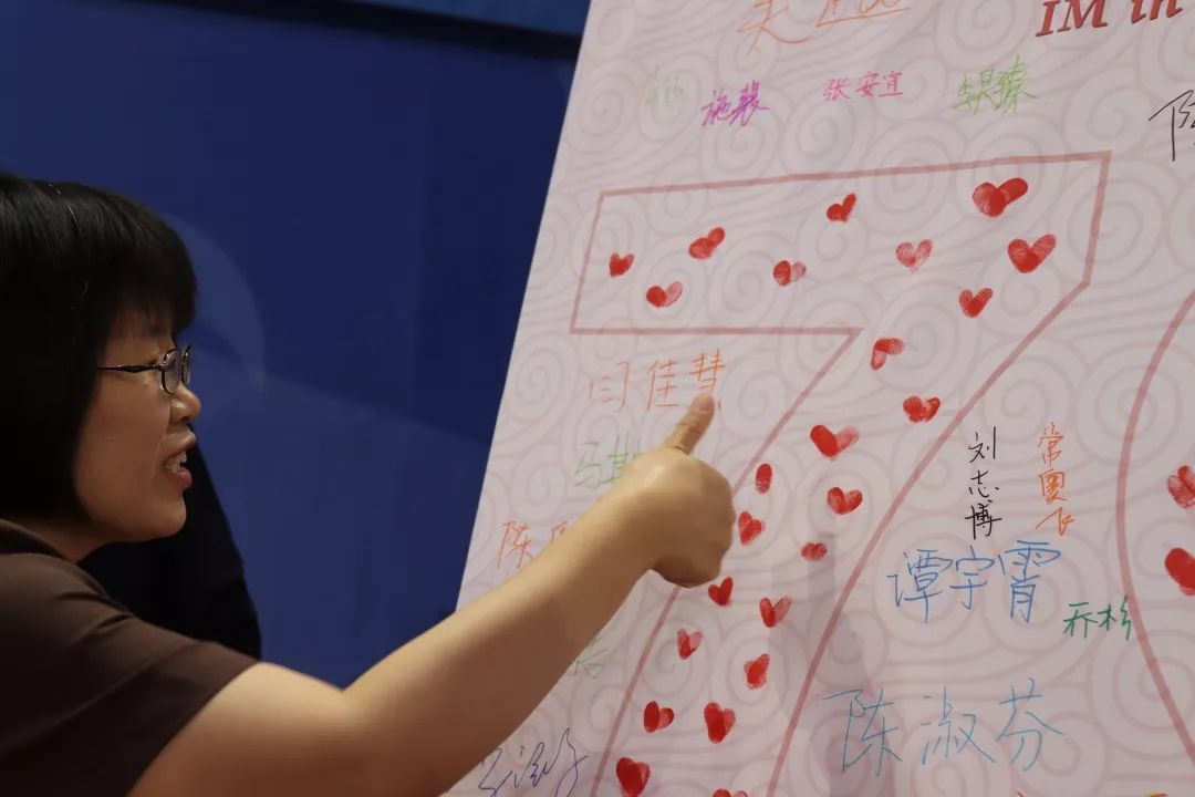 系党委书记、系主任张久珍教授与新生一起将对祖国的“比心”印在主题展板上