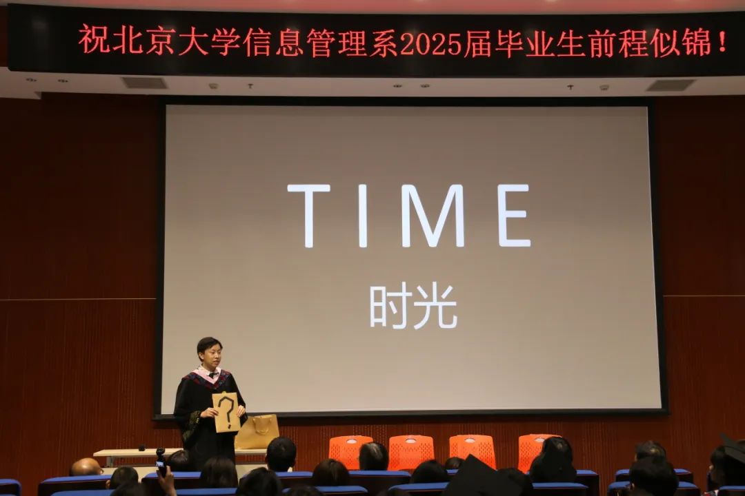 信息管理系主任张久珍老师以“拼·接”为题,向2025届毕业生深情寄语。她从日常生活中的一幕铺路景象出发,将人生比作一场不断“拼接”的过程——从燕园的学习时光,到未来的求职深造、生活抉择,每一段经历都是通向完整人生的拼图碎片。她鼓励同学们在不断拼合中保持韧性,在不确定的时代中以信管赋予的“说明书”为底色,勇敢探索、持续学习、坚定前行。她指出,北大信管教给我们的,不只是知识本身,更是一种面对变化的能力与信心。即使前路充满挑战,也请同学们守住底线、坚持诚信,努力成为能够影响环境、推动改变的人。她特别提到“拼·接”中间的那个“点”,寓意每一位毕业生都应将个人成长拼接进民族复兴的宏大图景之中,在中国式现代化的征途上持续“拼”搏、“接”续奋斗。在发言最后,张老师也寄语毕业生们常回“家”看看。她真诚地说,不论未来身在何方、是否“衣锦”,北大信管永远是大家可以栖息的港湾,欢迎每一位信管人重返这片孕育梦想与初心的土地,再次整装出发。