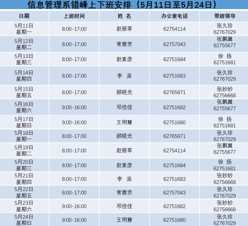 信息管理系疫情防控期间错峰上下班安排(5月11日至5月24日)