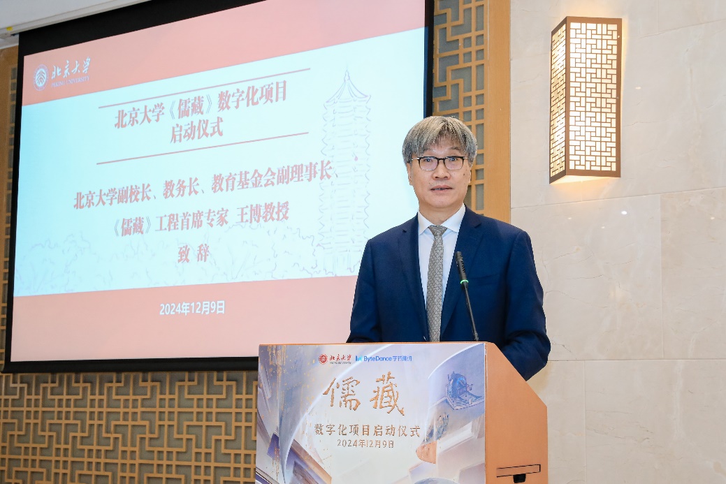 王博回溯了《儒藏》工程21年的发展历程,并向推进《儒藏》工程的代代学人表达了崇高的敬意。他指出,数字人文技术的迅猛发展,为古籍整理、研究和普及提供了巨大的便捷,也必将助力新时代《儒藏》工程。王博感谢北京字节跳动公益基金会为《儒藏》提供的宝贵资金和技术支持,并表示,要积极响应国家古籍数字化战略要求,重点推进《儒藏》文献的数字化整理、智能化利用和网络化传播,为国家古籍数字化战略的顺利实施作出新贡献。